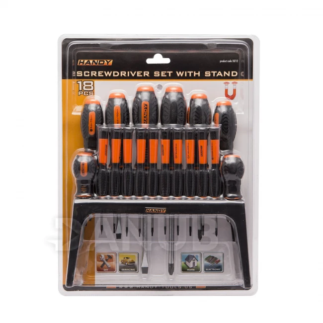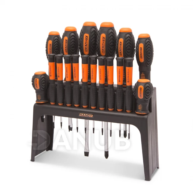 A Handy csavarhúzó készlet segítségével gyorsan és egyszerűen dolgozhat. A szárak nagy szilárdságú CR-V anyagból készülnek, így ellenállnak a kopásnak. A csúszásmentes anyagból készült ergonomikus fogantyú kényelmes és biztonságos munkát biztosít. A fali vagy asztali állványnak köszönhetően szerszámai mindig jól láthatók.
