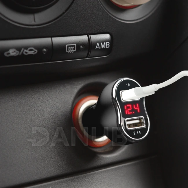 Adapter autós öngyújtóba kettős USB porttal, feszültség- és áramméréssel. A két USB-port közötti rejtett LED-kijelző piros színnel jelzi az aktuális feszültséget és az áramerősséget.A krómozott perem elegáns megjelenést kölcsönöz, így jól mutat a jármű belsejében.A kettős USB-port két eszköz egyidejű töltését teszi lehetővé.