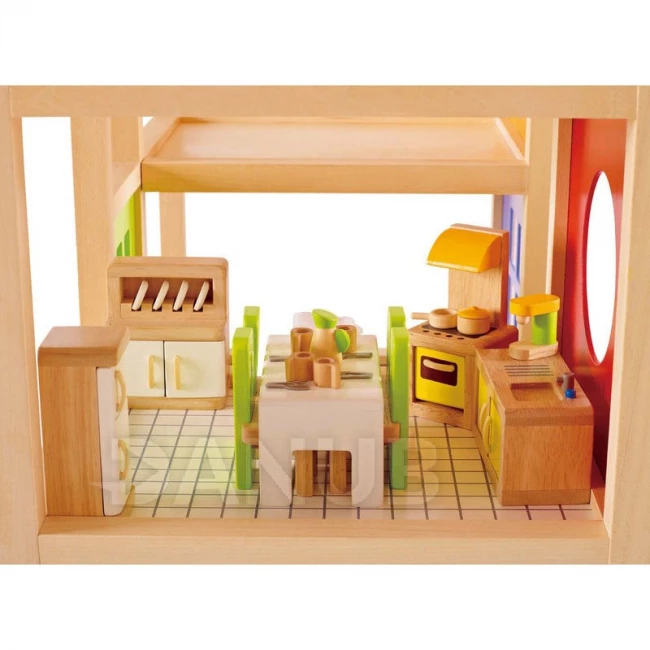 A babaház konyhájának fa bútorai és tartozékai közé tartozik egy hűtőszekrény fagyasztóval, tűzhely páraelszívóval, szekrény mosogatóval, kávéfőző, edények.