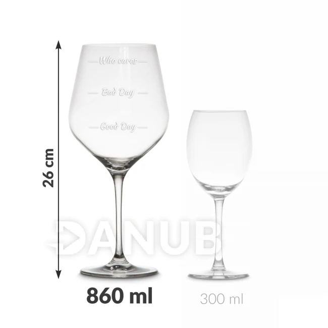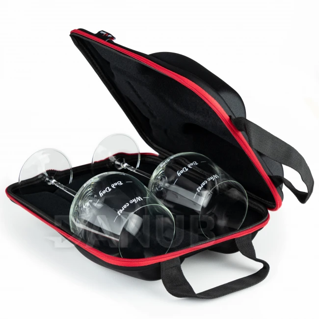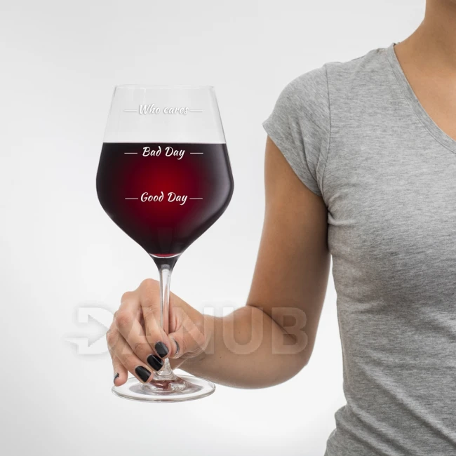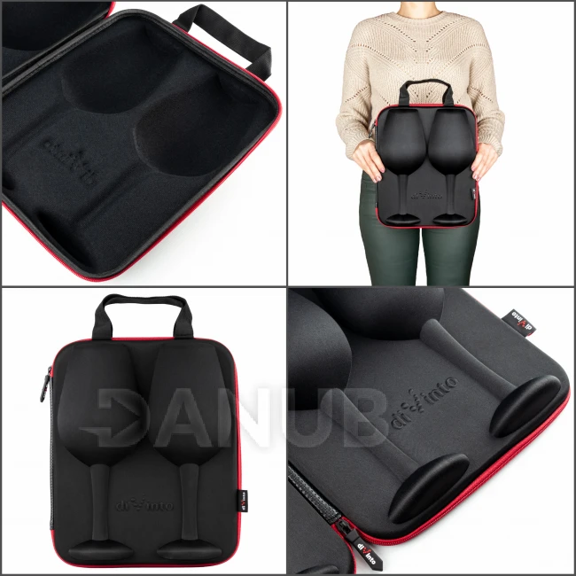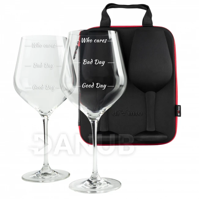 A készlet két diVinto borospoharat és egy tokot tartalmaz. Mindegyik pohárba egy teljes üveg bor fér. Ajándékozásra kész, további csomagolás nem szükséges. A terméken látható felirat: Good Day / Bad Day / Who cares. A termék a 003611839-0001 számú bejegyzett közösségi formatervezési mintaoltalom alatt áll. A termék bejegyzett védjegyoltalom alatt áll.