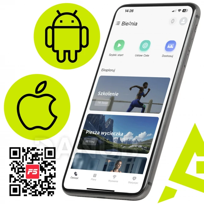 - A futópad a FitShow mobilalkalmazással érkezik, amely előre beállított edzésterveket kínál, nyomon követi a fejlődést, és lehetővé teszi a futópad okostelefonról történő vezérlését
