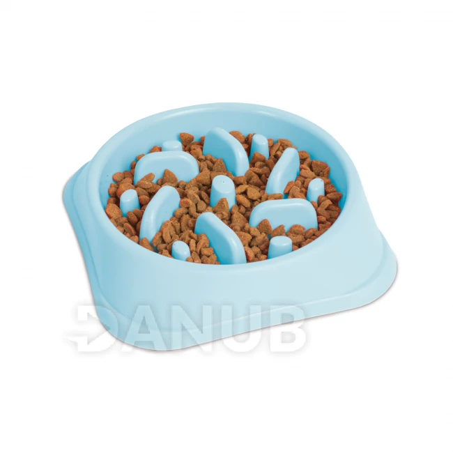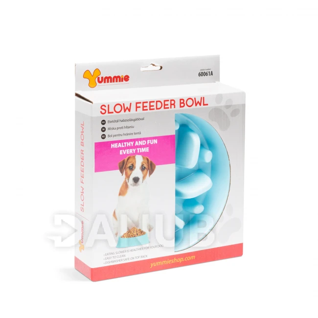 - Speciális kialakítású, műanyag etetőtál, amely megakadályozza a háziállat túl gyors ételfogyasztását. A tál aljában lévő kiemelkedéseknek köszönhetően a kutyus, nem tud habzsolni, így elkerülhetőek az esetleges emésztési problémák, felfúvádások. A kutya játékos formában, apránként tudja csak kiszedni az ételt a tál különböző magasságú kiemelkedései közül, ezáltal lassítható, megakadályozható a túlzott napi ételbevitel.