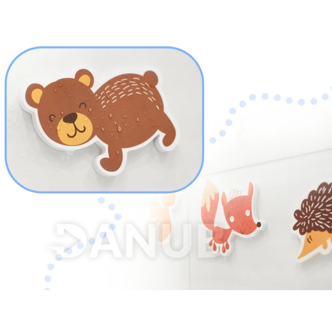 Minden elem puha és tartós habszivacsból készült. Nincs szükség ragasztóra ahhoz, hogy a puzzle a kádon vagy a csempén maradjon. Csak áztassa be őket vízbe.