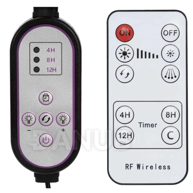 - A lámpa két távirányítóval rendelkezik: az egyik a kábelbe van beépítve, és be-/kikapcsolási, időzítő, fényerő-beállítási és színváltási funkciókkal rendelkezik; a másik távirányító be-/kikapcsolási, fényerő-beállítási, színváltási, világítópanelek kiválasztási és időzítő funkciókkal rendelkezik.