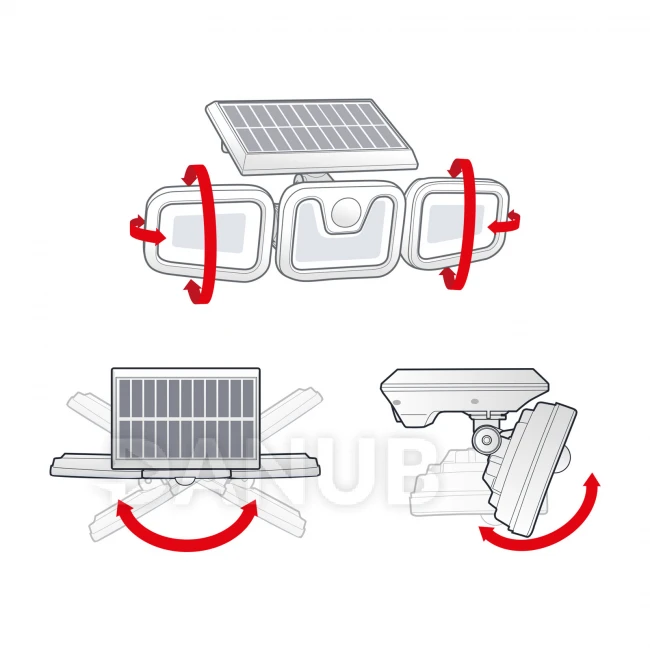 Nagyteljesítményű mozgásérzékelős fali reflektor, amely három forgatható COB LED és 1 db nagyméretű szolár egységből áll. A két tengely mentén forgatható LED-ek szabadon állíthatóak, így garantáltan minden körülmény között bevilágítják a szükséges területet. Ideális lehet teraszok, bejáratok, kocsibeállók megvilágítására. A napelemes kialakításnak köszönhetően, nincs szükség kábelezésre, villamos hálózat kiépítésére, könnyen felszerelhető a falra. Sötétben, kevés fény esetén mozgás hatására automatikusan bekapcsolja a COB LED fényforrást. A világítás ~20 mp elteltével automatikusan lekapcsol. Napközben a napelemnek köszönhetően újra feltöltődik a beépített akkumulátor.