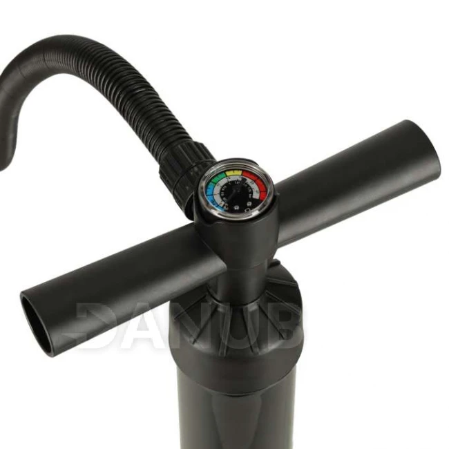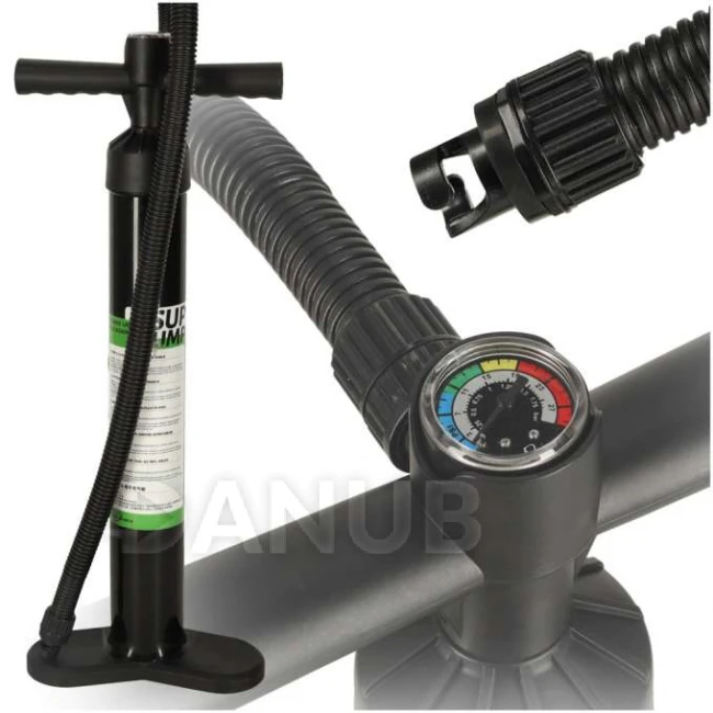 A nyomásmérővel ellátott kézi pumpa praktikus eszköz a különböző típusú felfújható termékek, különösen a SUP deszkák felfújásához. A beépített nyomásmérő lehetővé teszi a nyomás pontos ellenőrzését, és biztosítja az optimális felfújást. A stabil lábtartó megkönnyíti a használatát, a T-alakú fogantyú pedig kényelmes és biztonságos fogást biztosít, ami növeli a használat kényelmét.