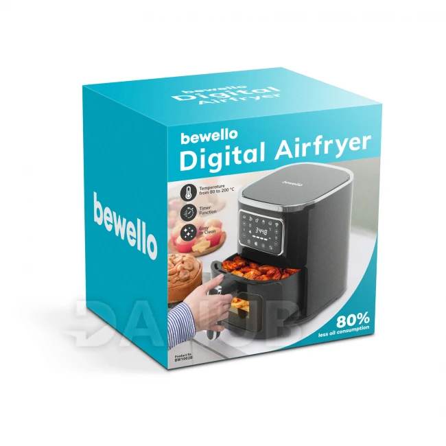 Energiaellátás: 220-240 V - 50/60 Hz - 16 A Teljesítmény: max. 1450 W Sütőkosár űrtartalma: 5 L Hőmérséklet szabályozás: 80 - 200 °C Visszaszámláló időzítő: 0 - 60 perc (perc osztásban) Mosogatógépben mosható: Nem Túlmelegedés elleni védelem: Igen Hőszigetelt burkolat: Igen Védelem: IP20 Méret: 35 x 26,7 x 30 cm Sütőkosár méret: 21 x 21 x 10 cm Súly: ~3870 g Szín: Fekete Kábel hossza, típusa: 70 cm, 3G0,75mm²