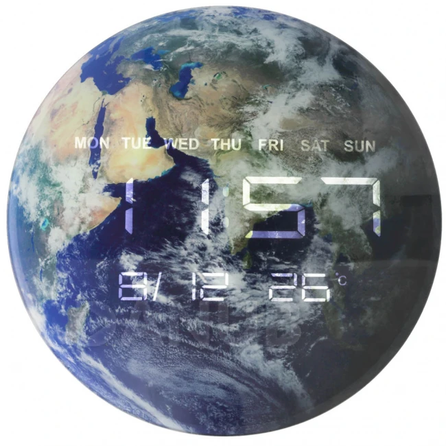 A Föld témájú falióra a funkcionalitás és a stílus tökéletes kombinációja. Az intuitív kijelzőn az idő (12/24 óra), a dátum (H/N/É formátum), a hét napjai és a környezeti hőmérséklet látható. Praktikus funkció a hét aktuális napjának folyamatos megvilágításával (angol nyelven). Falra akasztható vagy a mellékelt állványra helyezhető. A hálózati tápellátás biztosítja a folyamatos működést, a CR2032 elem (tartozék) pedig megvédi a beállításokat a véletlen újraindulástól.