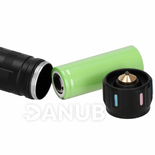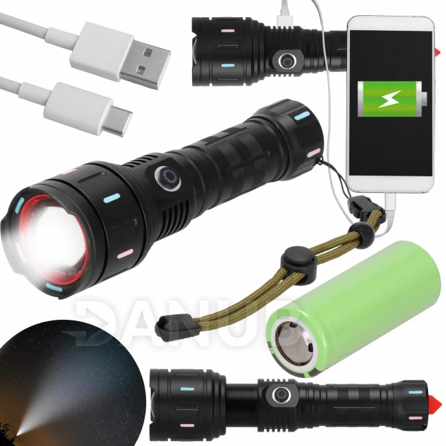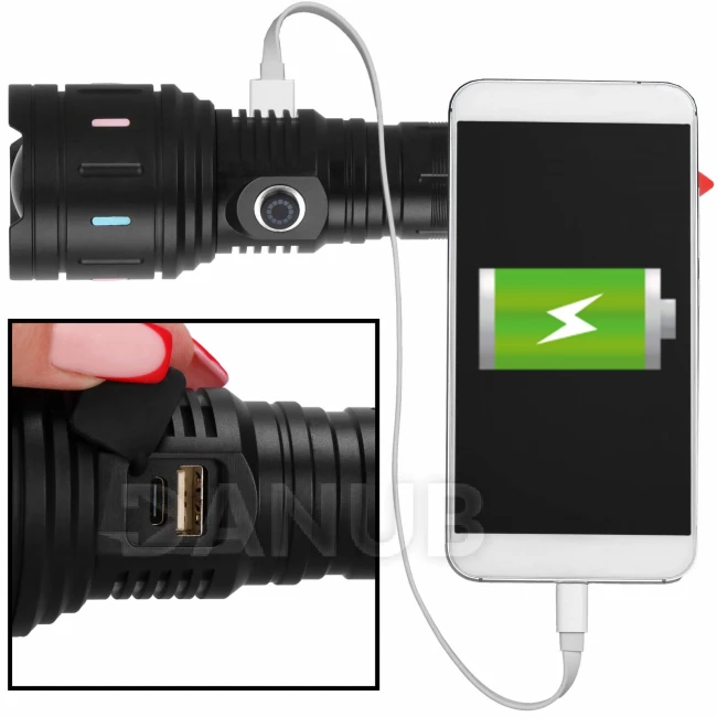 - Két bemenettel rendelkező USB-csatlakozó - USB és C típusú bemenet a zseblámpa világítórészén