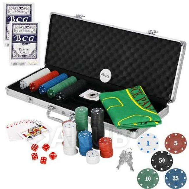 Póker készlet - bőrönd + 500 zseton + kockák + játékszőnyeg