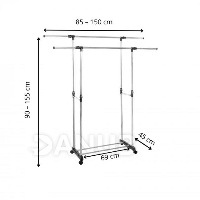 Ruhatartó állvány - dupla - 85-150 cm kerekeken - alumínium - teleszkópos