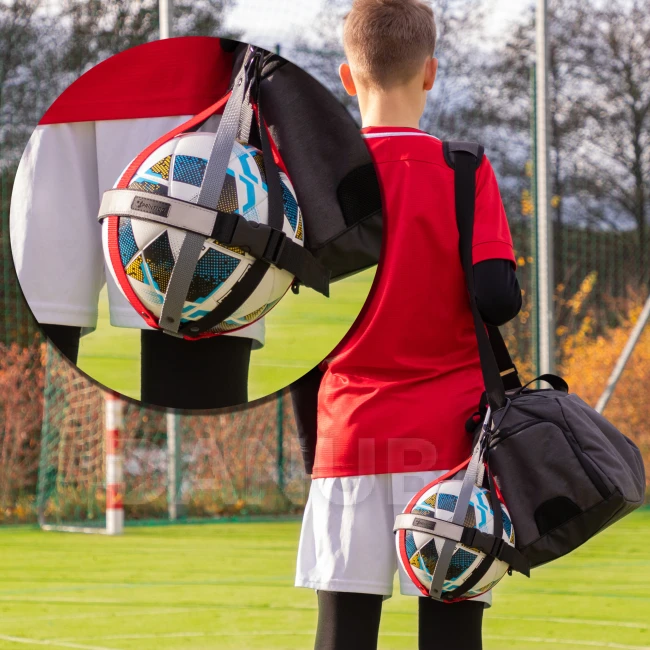 Univerzális tartó a labda rögzítéséhez és hordozásához hátizsákon vagy sporttáskán.